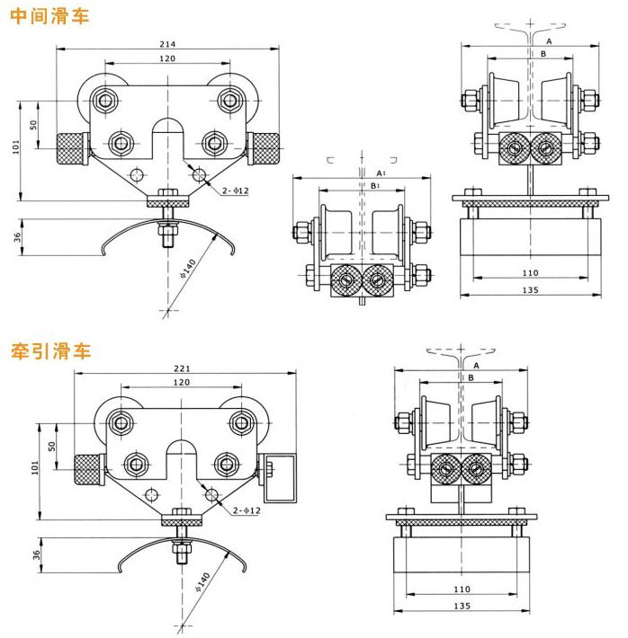 8、滑車裝置上的雙墊圈為調整墊圈,當導軌不合適時,把墊圈放在固定板的內側,以調整軌距的寬窄,出廠時按導軌為I 100*68*4.5、I 120*74*5、I140*80*5、I 160*88*6制造。非標滑車按圖紙加工制作。