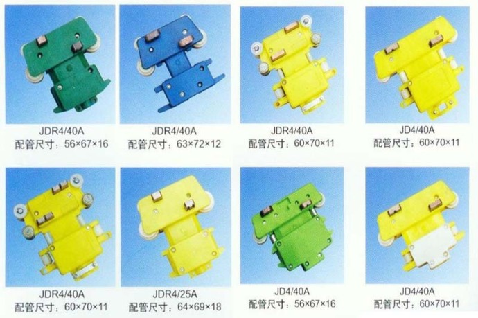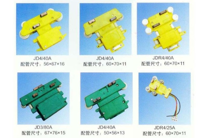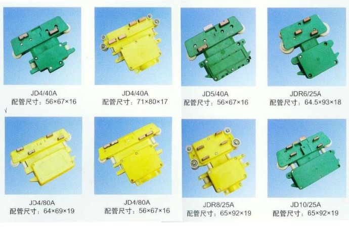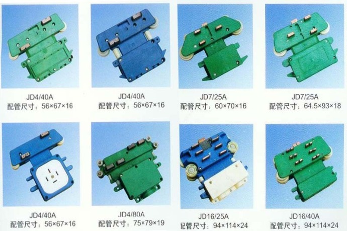 大三極、雙電刷、普通轉彎、轉彎、大頭雙電刷、高低腳轉彎、高低腳、多極滑觸線集電器普通型四極、高低腳四極、普通型、普四極ZJG、小雙電刷、五極、四極、雙蓋雙孔、六極轉彎、小七極管、大七極管、八極轉彎、十極管、十六極、防塵雙電刷、大四極、四線插座多極滑觸線集電器。