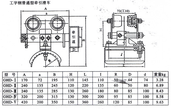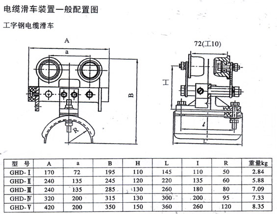 GHD-II型工字鋼電纜滑車用于移動供電機械在移動中電纜的懸吊與移動,已廣泛應用于各類起重機械中。工字鋼電纜滑車該裝置具有結構堅固。移動靈活。安全可靠等優點滑車由牽收引滑車、電纜滑車、終端滑車三部分組成,牽引滑車跟隨移動機械導纜(牽引)裝置,每個移動機械配1個,隨移動機械往返運行。中間電纜滑車將電纜懸掛在工字鋼軌道范圍內隨牽引滑車移動,兩端并裝有緩沖撞頭,滑車視移動長度不同而定數量。終端滑車固定在工字鋼導軌末端,一般每個移動機械設置1個。工字鋼電纜滑車該系列滑車分Ⅰ、Ⅱ、Ⅲ、Ⅳ、Ⅴ五種型號,如用戶采用12#、14#、16#或更大號數工字鋼,可在訂貨時注明,本廠可成套供貨。